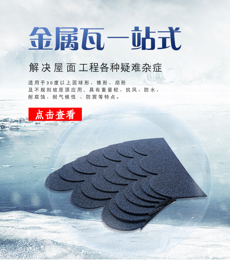 金屬魚鱗瓦表面顯圓錐凸感,高檔、雅致,復古中帶有現代感,淡雅含蓄,細膩天成,立體感強。適用于30°以上的圓球形、錐形、扇形及不規則坡屋頂的應用